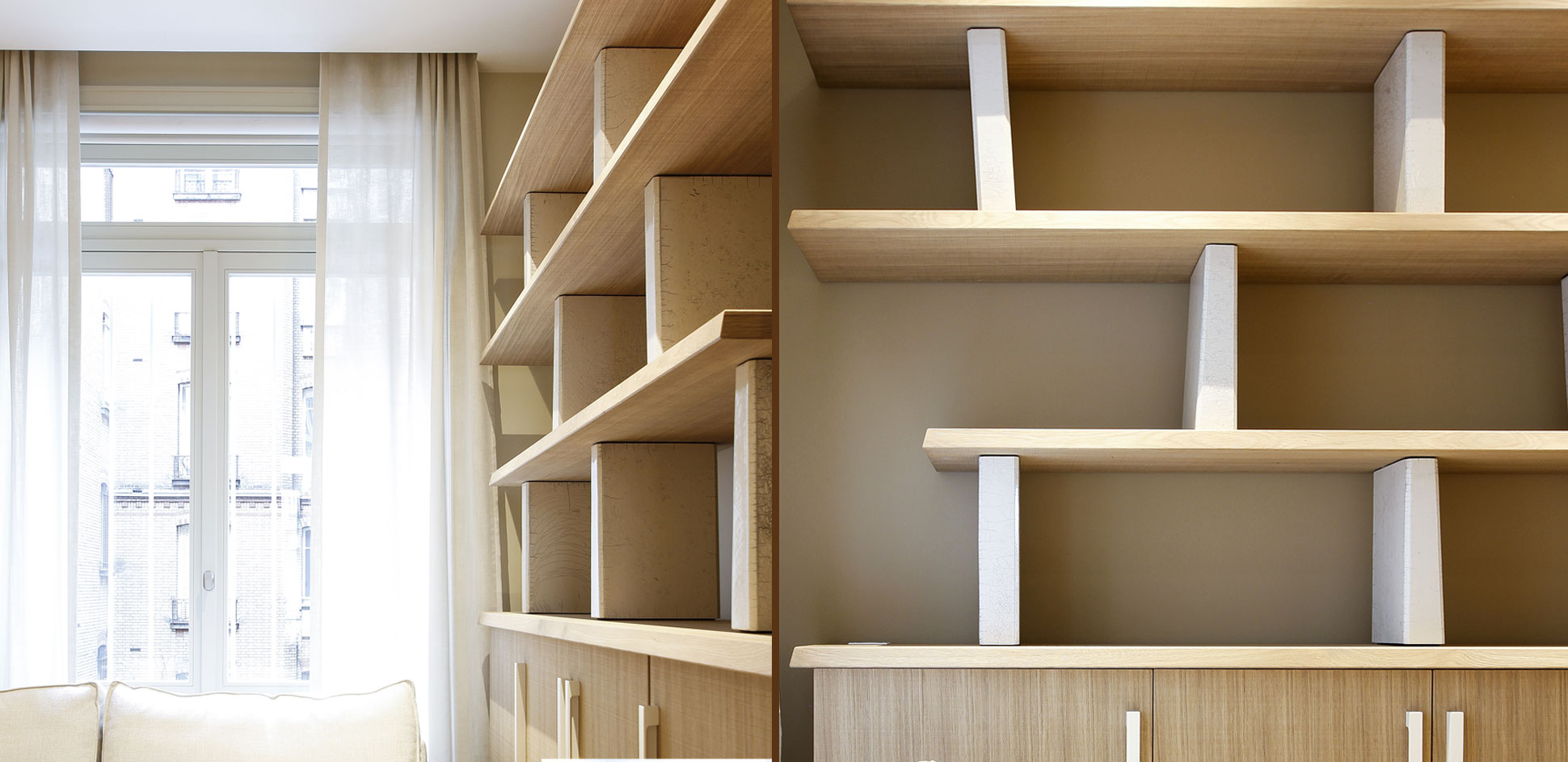 The living room is separated from the dining room by a Claustra inspired bookshelf, thought like a sculpture mixing strength, roughness and delicacy or imperfections.