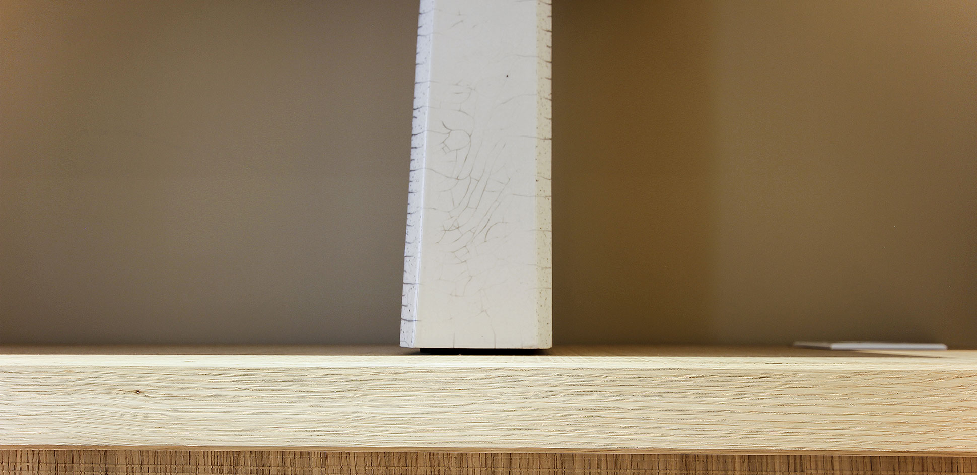 On the floor: two white plaster monoliths inspired by Brancusi and shelves in rough-sawn wood. On the shelves, delicately inclined raku cross pieces giving rhythm and segmenting the space.