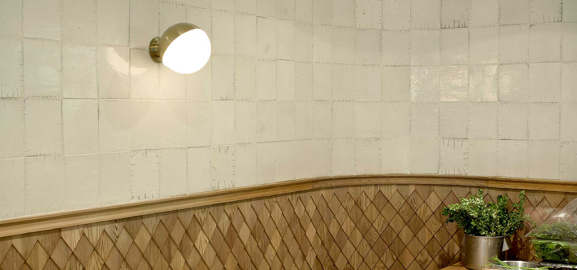 avec l'architecte d’intérieur et designer Charlotte Biltgen, les créations en Raku écru de Fabienne L’Hostis (carrelage et assiettes) pour leur restaurant « Clover Green » en plein cœur de Saint-Germain-des-Prés à Paris.